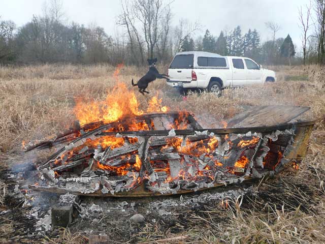 Tiller, Greg's 8-month-old lab-mix, was having a ball. At first, he'd jump in the water, climb out and run through the crowd until he found a couple of people not paying attention and then shake off. This was a real hoot in the near freezing temperatures. When he got tired of that, he started leaping up and biting at the smoke. |