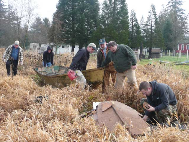 We discussed burning it right side up or upside down, finally settling on right side up. It just seemed like the correct way to do it. We dragged it into place, then filled it with bits of the smashed up boat and other pieces of wood we found on Greg's property.