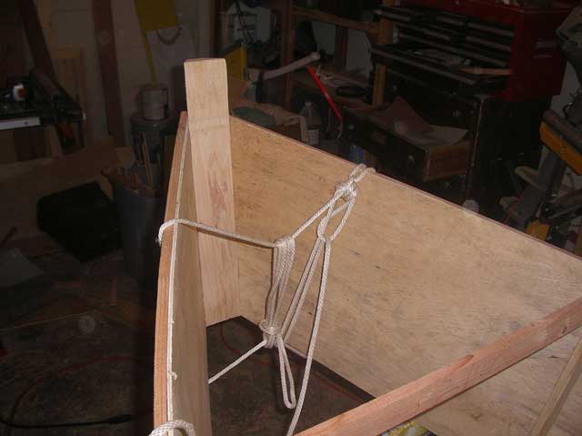 Here you see my sliding windlass I used for bringing the bow together. This was really tough to do alone. You have to get it right or the boat will be out of true. It took me 2 tries and a little glue in the eye, but I got it done.