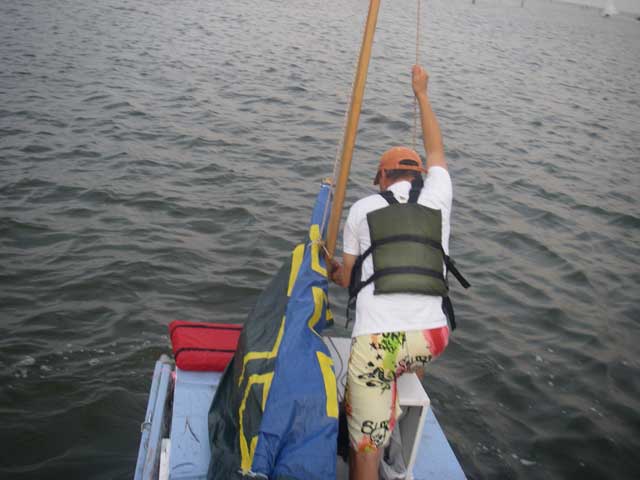 . . . while Gordo struggled to raise his sail. Gordo learned the importance of being able to raise and lower the sail from the cockpit.