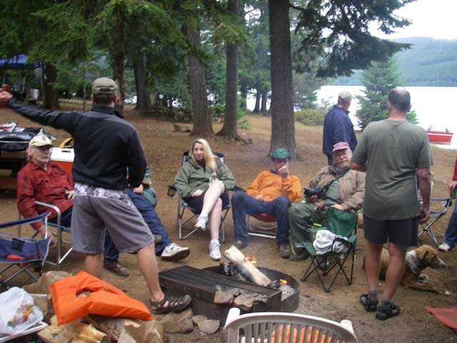 Coots back at the campfire. You can see a damp Jerry and unrepentant Morgan on the right.
