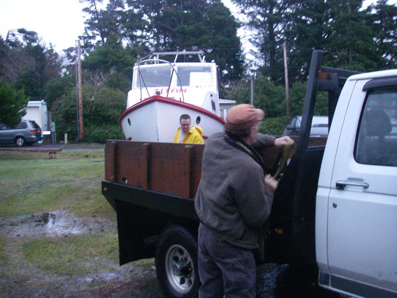 Greg, on the otherhand, has never seen a boat that wasn't just perfect. We had checked out Titan a few weeks ago and Greg was in love. It was now time to drag her over the coastal mountain range and park her at Greg's swamp of a farm in Turner. Greg enlisted doyryman Mike to help, since Mike had the truck to pull the 8,000# boat. |
