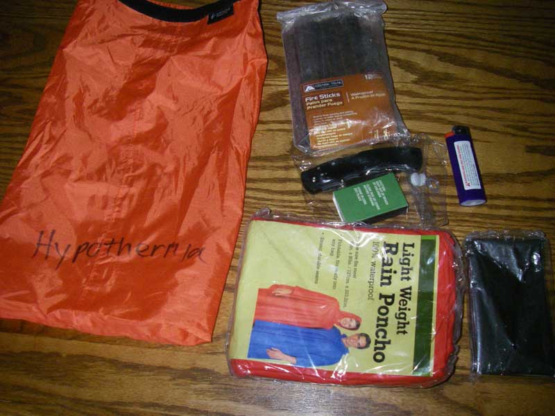 Speaking of hypothermia: I have a hypothermia kit. In addition to the multiple layers of clothing, I have a space blanket, a poncho, fire starting sticks, another lighter, more water proof matches, and, for some reason, another knife (that's 2 so far.) Perhaps the knife is for opening up a manatee and crawling inside (and you thought they smelled bad on the outside!) |