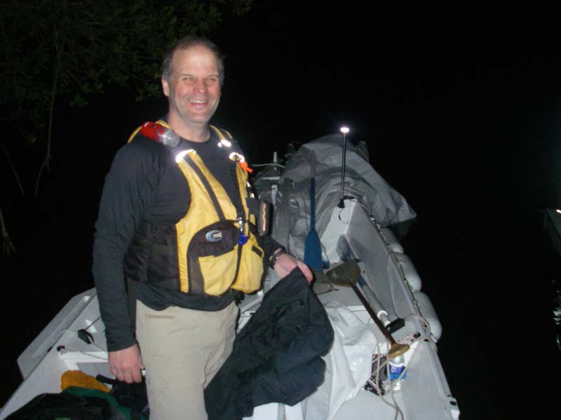 It was a tough slog to CP1. We had problems with the swing bridge, so we had to drop our masts and sails and paddle underneath. We were still almost a mile and a half to the checkpoint, in the dark and at low tide. The path is very twisty and the water very shallow. I had to strip down to my skivvies and push us off the mud twice.