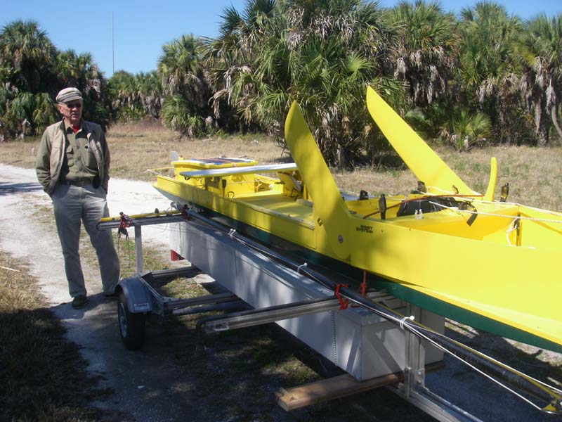 | March 5 was "inspection day" when all the boats were brought to the beach and checked out for safety and required equipment. This is Meade Gougeon, founder of West System epoxy. He showed up with his boat Yello Thing, some kind of a 20ft long board boat with a sliding seat and batwing sail. That's right, dude's a genuine legend in the boat building world, a visionary, and, as the oldest competitor in the event, has more courage in his little toe than me (that's for sure.) | |