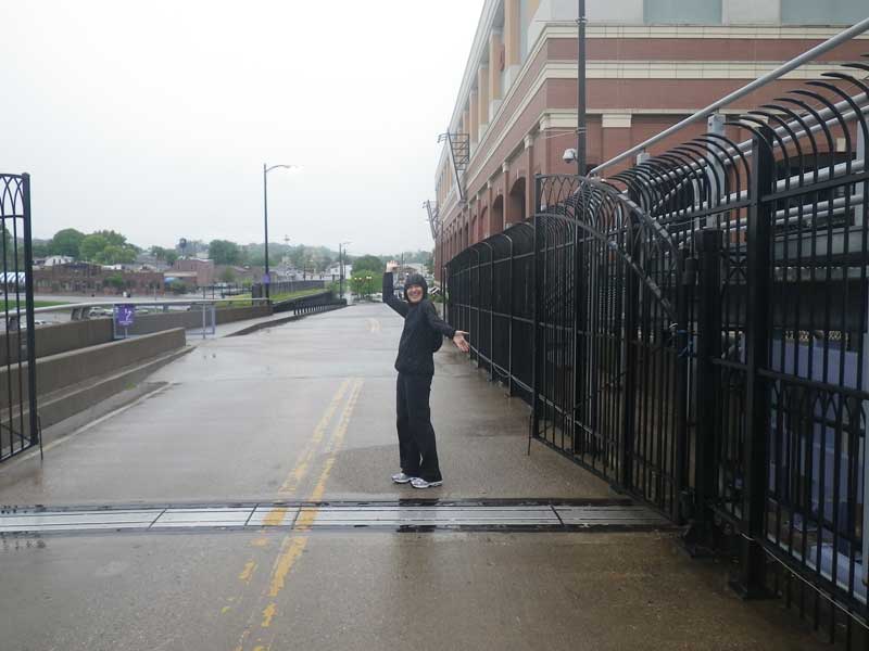 There's my darling, welcoming me as I step off the Purple People Bridge, crossing from Ohio to Kentucky. I learned two things that day: Not all Kentuckians are straw-chewing, overall-wearing bumpkins AND that Kentucky owns the Ohio River, so I had actually crossed into Kentucky when the bridge went out over the water. |