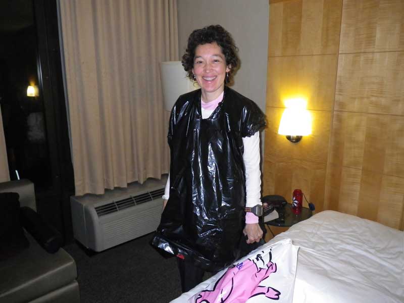 The next morning was Race Day, and it was pouring down rain. Keely had the foresight to bring these stylish garbage bags so we could be at least moist and dank instead of downright sopping.