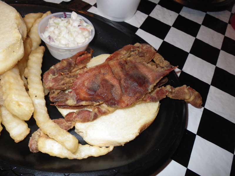 This is something we don't have at home, softshelled crab. Seems simple enough, just toss little bugger between hamburger buns, add a little coleslaw, and yer golden (well, he is, anyhow, golden deep fried.)