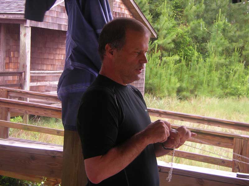 That 'hell of a day at sea' turned into a miserable night on shore - especially when I discovered my very expensive "Waterproof yet breathable" bivysack was neither. After 14 hours of trying to sleep in what was essentially a sack filled with water, I took my sopping gear to the covered pavilion at the visitor's center of Cape Lookout Lighthouse and spent 7 hours watching it dry. I passed the time by 'yarning' - unwrapping the fibers that make up a rope (an old practice sea captains used to do to make sure their people had busywork to keep 'em occupied.) |