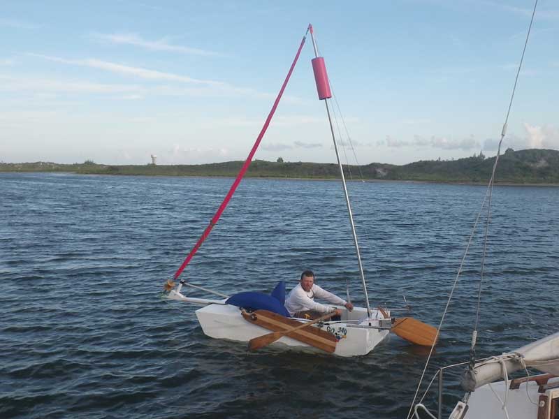 John Monroe's aft-mast rig gave up the ghost somewhere along the way, and he got towed first to a marina, then to the PIYC. Jason rowed it over to where we could haul it out.