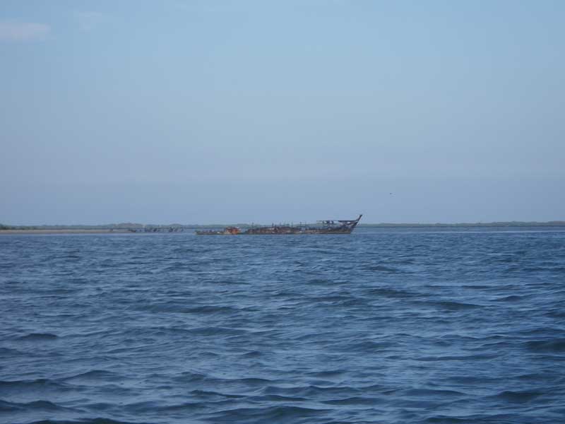 We were set to skim past the end of Mud Island when I noticed some birds walking around on the water. At about the same time, Jon noticed this shipwreck riding rather high on the water.