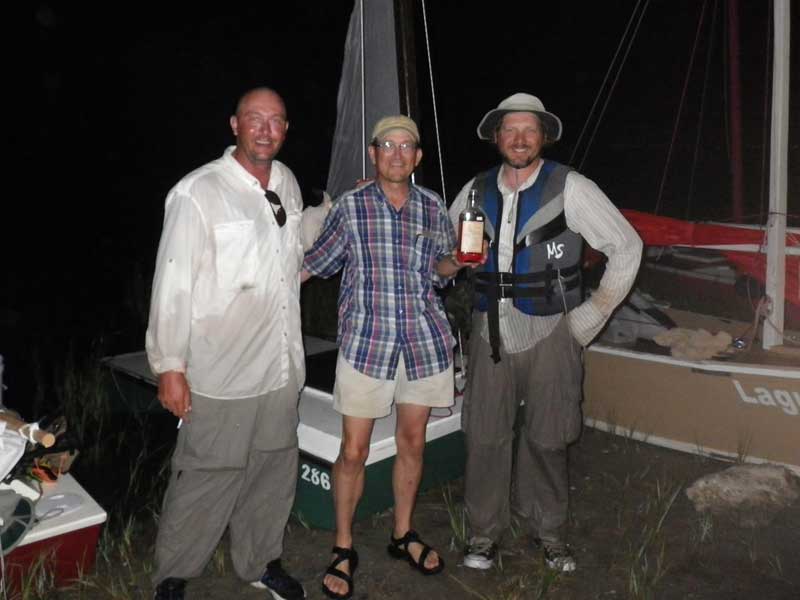 The 'Duckers came in at a respectable 9:30 or so, Kevn first, then Jon. They were met on the beach by an adoring crowd and a bottle of Sailor Jerry's, celebrating the first Puddle Duck Racers to ever reach Army Hole. Good job, guys!