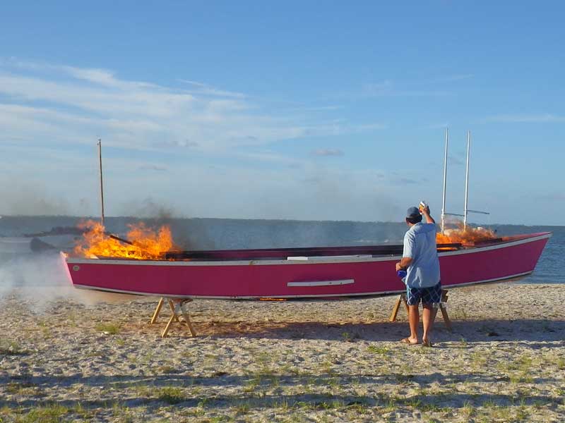 It turns out it is a lot harder to burn a boat than one might imagine, especially on a very hot day. Gasoline evaporates too quickly. Bobby brought two bottles of charcoal lighter fluid and got things cooking.