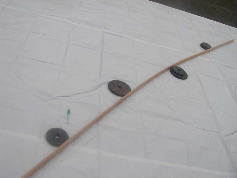Following the layout plan, I make my marks and lay the batten to meet them. I do this on concrete, so I use weights to hold the batten in shape. It sorta, kinda works, but it might be nice to use pins or something.