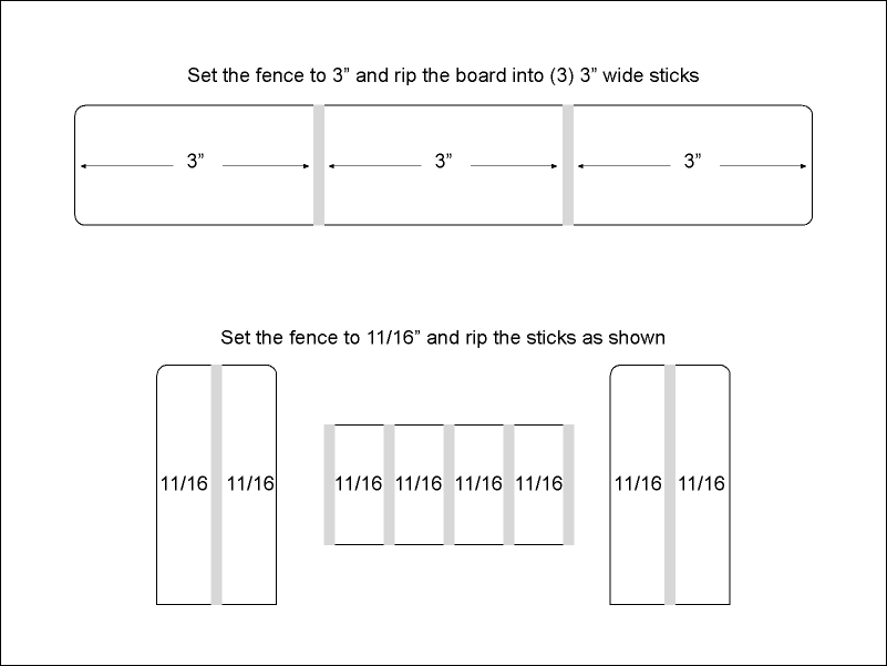 on my hands and wanted to make some hollow masts. Lowes had a pretty knot-free 16' 2x10 for $11.22. That, and a bottle of TiteBond II and I was on my way. The first task is to get the 2x10 (very heavy - green Doug Fir) down to a manageable size. A 2x10 is actually 1.5x9.25, and a sawblade is 1/8 thick, so it is quite easy to rip the 2x10 into (3) equal planks. From there, I need to rip those planks into appropriately sized sticks. I decided to maximize the wood I had, so I ripped the sticks into the widest possible sizes - (1.5-1/8)/2 = 11/16. |