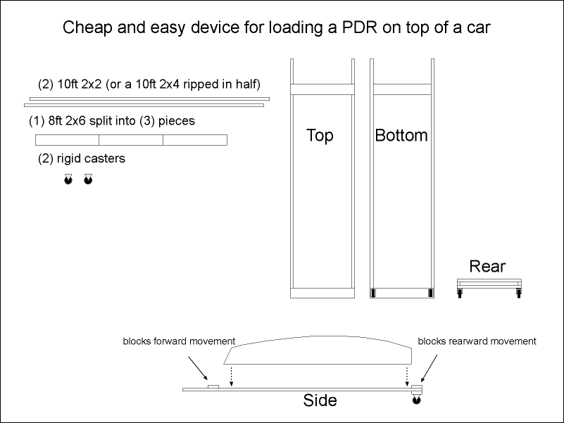 Harbor Freight has cheap casters - you don't want swivles, only rigid. Bigger wheels makes it easier to go over rocks and such. I show using a 2x6 here - mainly because it makes it easier to attach the casters with lag screws. A 4" caster just barely - and I mean barely - fits on a 2x4, and I don't recommend it. In use, you move the PDR around like a wheelbarrow. I use this to load my PDR on top of my Subaru. I wheel up to the back of the car, put the arms on the roof rack, go around back, and push it up. I then strap the whole thing to the roof rack. |