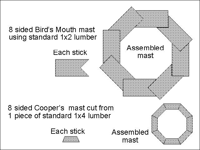 This essay shows how to make a very strong, very lightweight, Cooper's mast from a standard 1x4. The resulting mast has walls that are 1/4 inch thick and measures just under 2 inches across the flats.