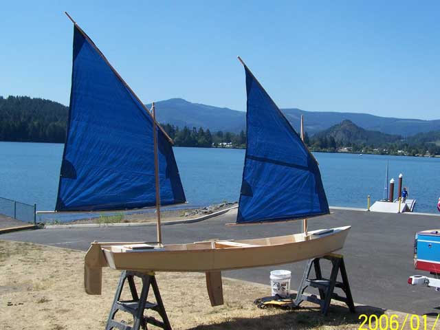 She really is a good design - for building, anyhow. People kept asking me if I was going to sail her. Come on! How's a guy gonna work the lines for 2 sails in a 11ft boat?
