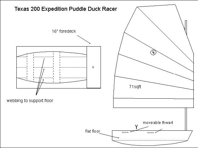 The Texas 200 is destined to be one of those grueling boat races where the most common question asked will be 'Why? Why am I doing this?' I'd love to do this race, but I don't think I'll make it. Still, it does not stop me from dreaming. These are the doodlings of my dreams. If I were to do this race, I'd use a Chinese Lug for the sail. Lug sails do not go to windward as well as Bermuda sails, but the Chinese Lug has that wonderful feature of built in reef points. I can't see any reason to have more that ~ 70sqft on a PDR, so a Chinese Lug with an 8ft boom is perfect. I'd also have a flat floor. With a flat floor, I can tell myself I have enough floatation to go with decking rather than airboxes. I also believe this will be more comfortable for sleeping. A PDR floats on its side in no more that about 4 inches of water, so 6 inch side decking will keep the water out as well as airboxes. With decking, I can stuff things under the decking, roll over in my sleep, and just have more options for stowage. I'd have (2) positions for my (1) seat: One position for sailing and one position for rowing. For comfort, seats need to be at least 10 inches above the floor (11 is better, 15 seems optimum, but 16 starts getting too high.) For rowing, the oarlocks need to be at least 6 inches above the top of the seat (7 is better, 8 seems optimum, 12 is too high.) I plan on sailing more than rowing, but to minimize cockpit obstructions and weight, I'd make only one seat and make it movable from one position to the other. |