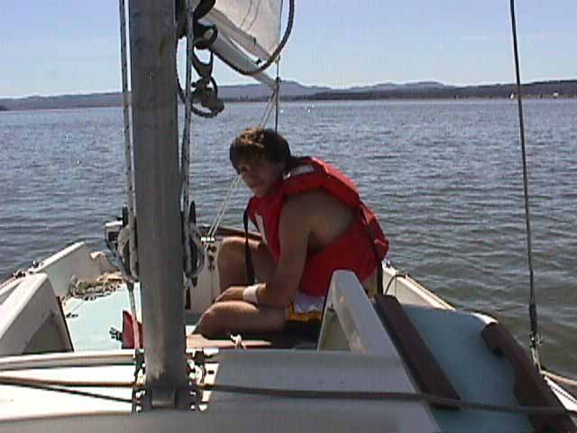 To get this shot, I had to crawl out on the bow. Remember the boat is only 15 1/2 ft long and to get this far away takes some tricks. My Uncle Stan, truly an ancient mariner, says the reason there are so many single-handed sailors is because there are so few people willing to crew. Fortunately, being a crewmate fits Griffin perfectly, except for this short spell at the tiller, he gets to sit there, basking in the sun and spouting off philosophy and commentary on current events. |