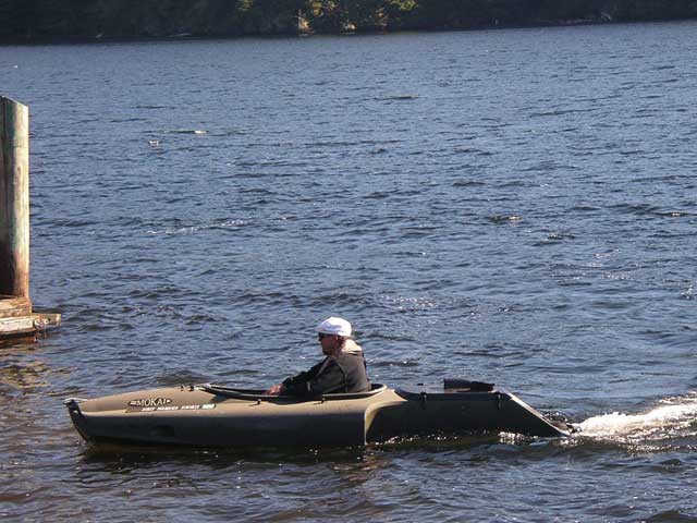 That powered kayak is really cool. It has a 6.5hp Honda in the back and scoots along at 10 - 11 mph.