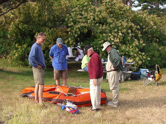 The big topic of the morning was Darrell's errant Zodiac. That thing was leaky last year, and after 12 months stored in the hold, it was still leaky. Miracle of miracles, all it took to get it to hold air was to have 4 Coots haul it out, look at it, pump it up, and put it back in the water. Truly - they did no repairs and yet the boat worked perfectly after being stared at. |