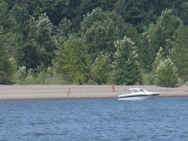 We made a pass by the nudie beach, but it was early in the day. As we approached at a ripping 4mph, the figures on the beach resolved themselves. We first determined they were all human and had all their arms and legs, but as we got closer, we decided they were all male, altered course, and sailed on. |