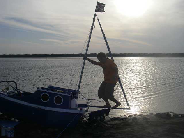 Jason had heard some cracking on his bowsprit, so he rigged some backstays for the mast and then tested the integrity of the system by bouncing on the bowsprit.