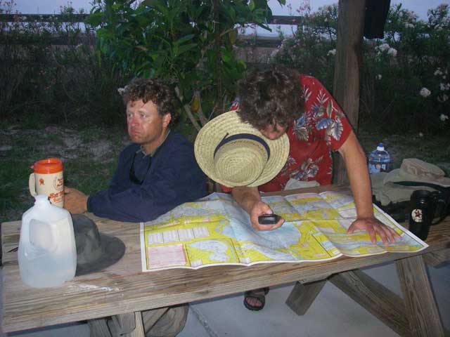 Jason and Jon prepare the route for the next day's passage. It should be noted that we were down to 3 functioning GPS units - mine had decided to lock up after the dunking. Waterproof my arse. Let it be known: The Magellan Explorist 210 is crap.